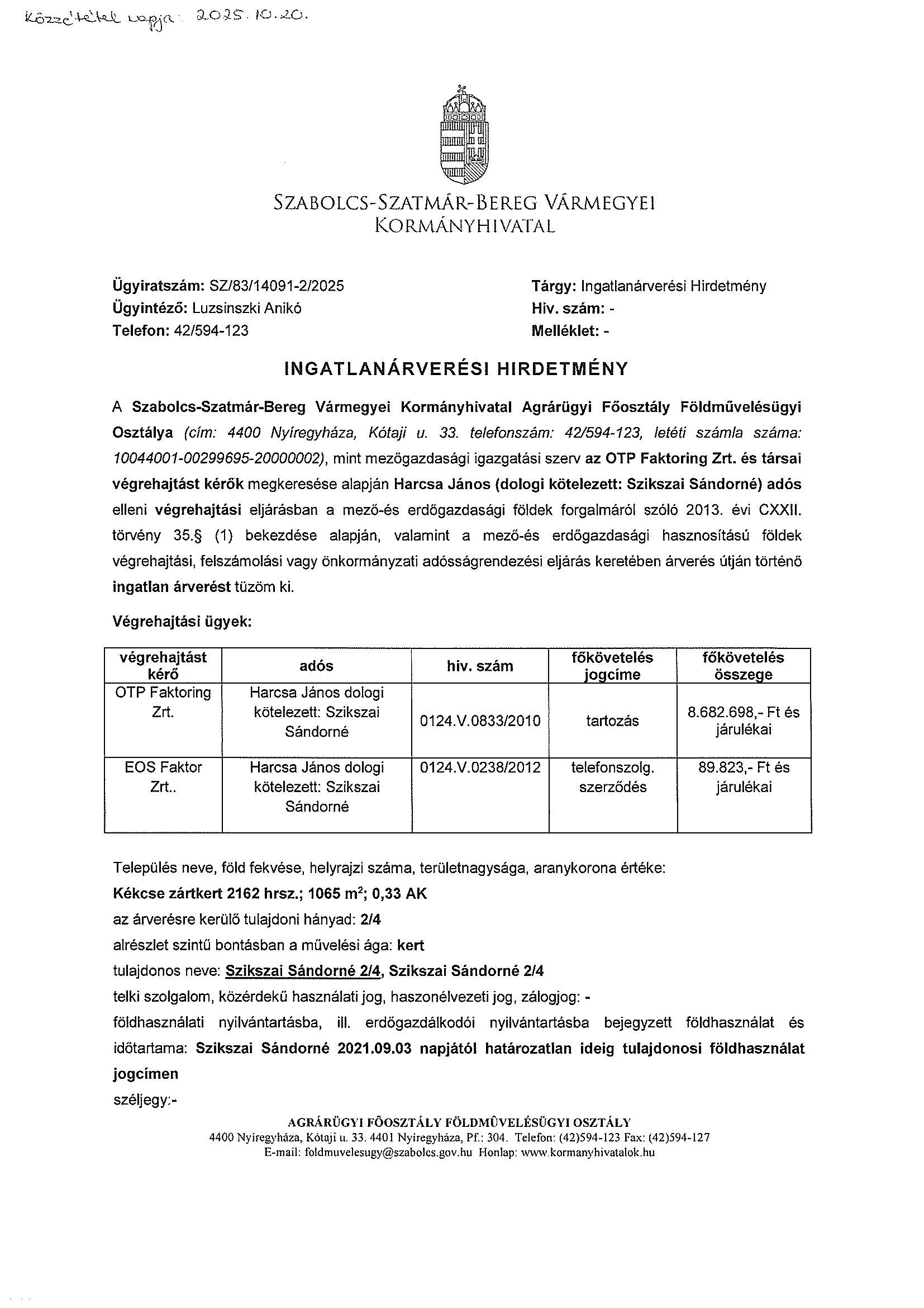 Ingatlan árverési hirdetmény - Kékcse zártkert 2162 hrsz.